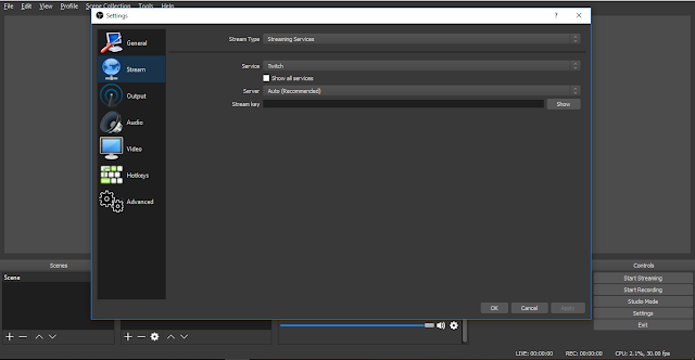 Cara memasukan stream key di OBS.
